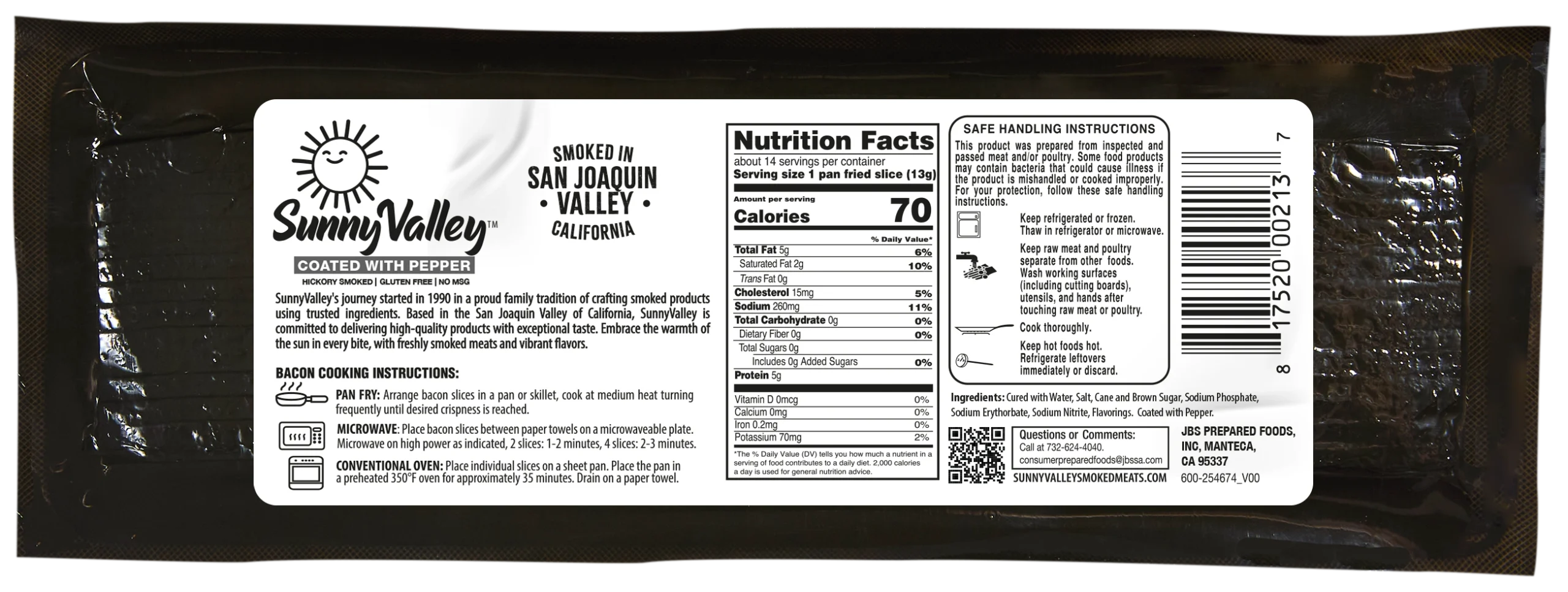 Pepper Bacon stands out for its bold, savory bite – bring cracked black pepper and slow-smoked richness together in a way that wakes up every slice. SunnyValley builds on this classic flavor by hand-rubbing our bacon with a proprietary pepper blend that enhances both the smoke and the sizzle.