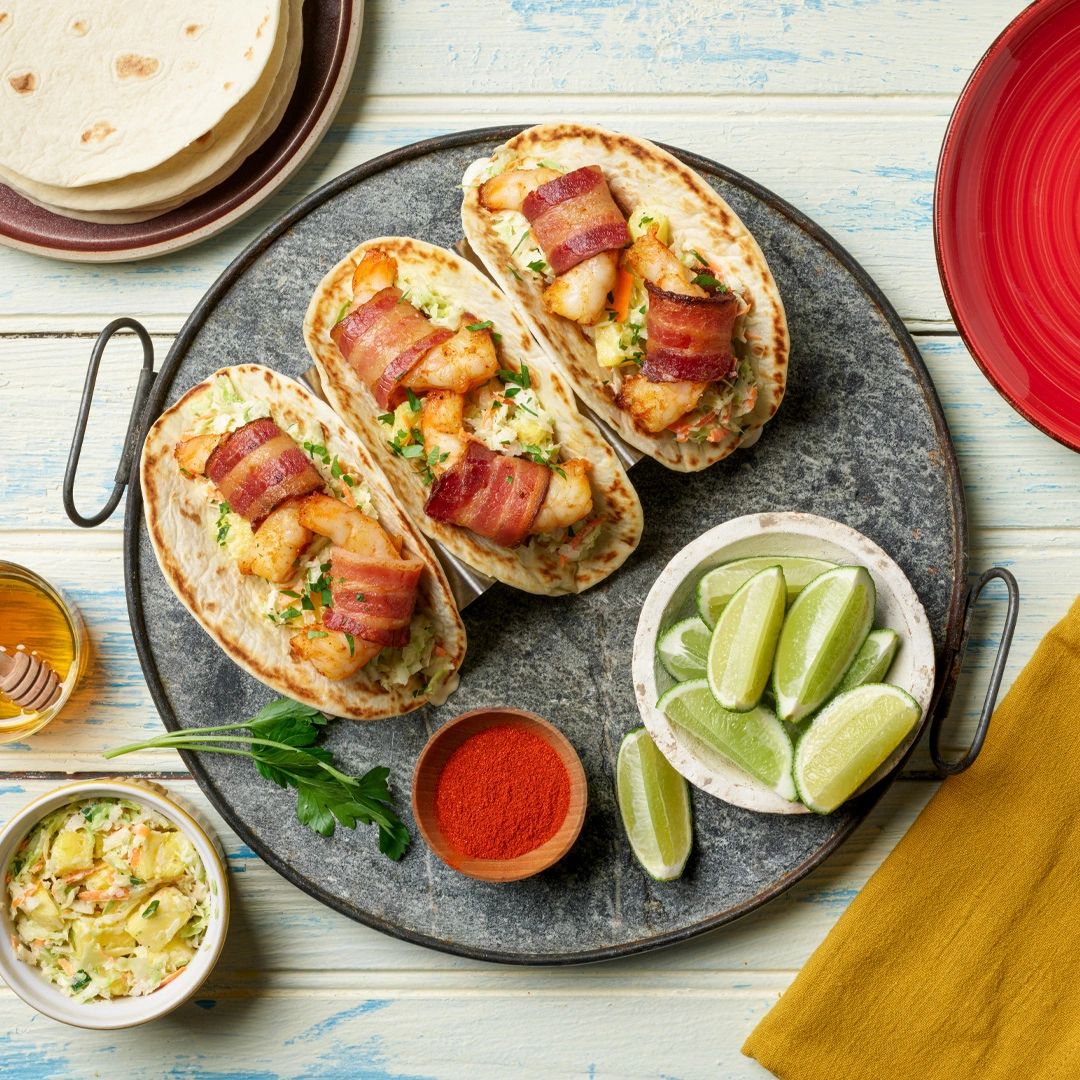 Bacon-Wrapped Shrimp Tacos with Pineapple Slaw