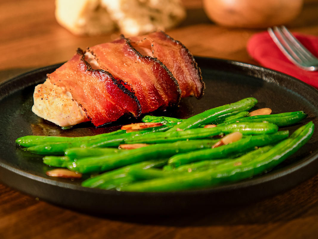 4. Wrap in Bacon: Wrap each chicken breast tightly with 2 slices of smoked pepper bacon, securing with toothpicks or kitchen twine.