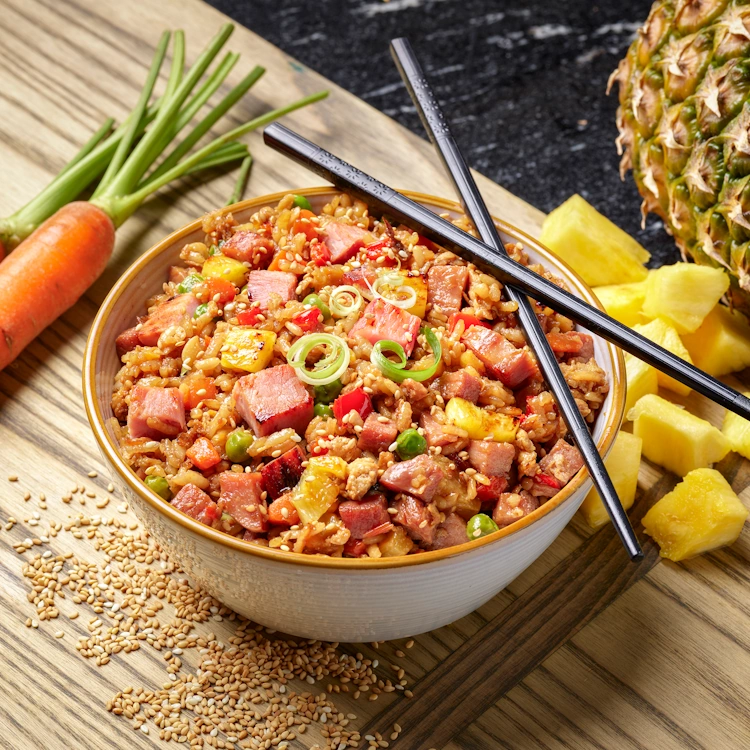 Our Ham & Pineapple Fried Rice brings together smoky SunnyValley Applewood Quarter Ham, juicy pineapple, and crisp vegetables in a quick, flavorful stir-fry. Tossed with jasmine rice, scrambled egg, and a savory blend of soy and sesame, it’s a fast weeknight favorite that’s just as good as takeout – if not better.